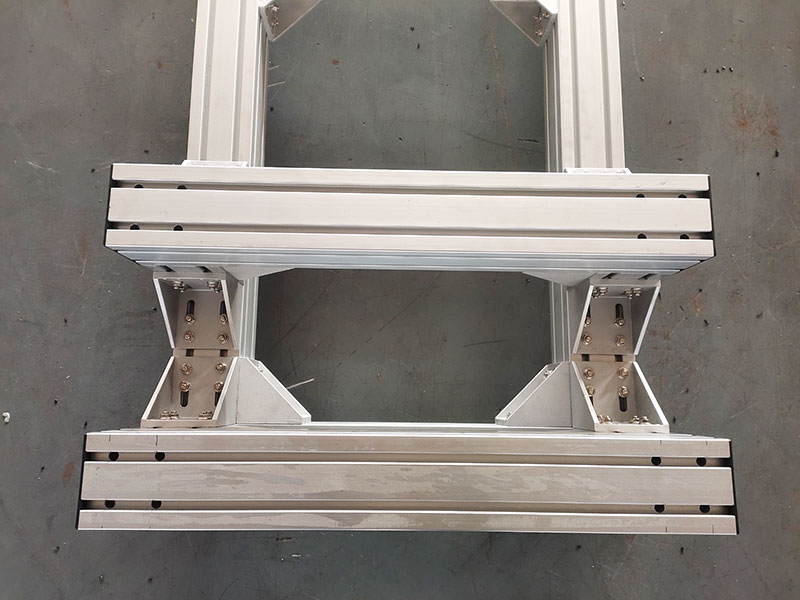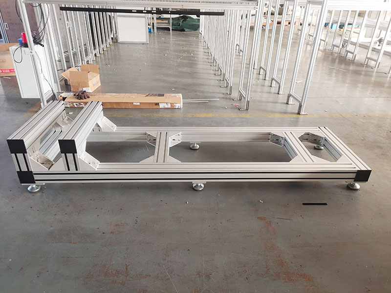 作為工廠精密設備的支撐底座,使用100100鋁型材,非常堅固,底部安裝6個金屬蹄腳,承重力強,外觀精美不生銹,橫梁可調節位置,方便機器安裝。